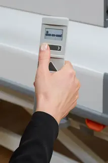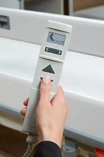 Der LCD-Handschalter liegt leicht und ergonomisch in der Hand. Er besitzt ein großes beleuchtetes Display und 3 Tasten. Der Handschalter bietet maßgeschneiderte Bedienebenen für Patienten, Pflegekräfte und technisches Personal.