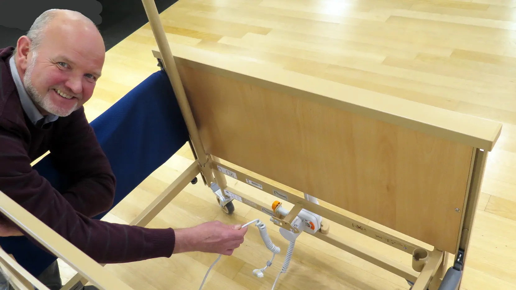 The Dali is usually delivered on a storage and transport aid. First assemble the bed. As you can see, two cables with connectors at the ends go out from the control under the centre of the mattress base. These cables must be plugged into the lifting motors by the technician. The procedure at the head and foot end is identical.