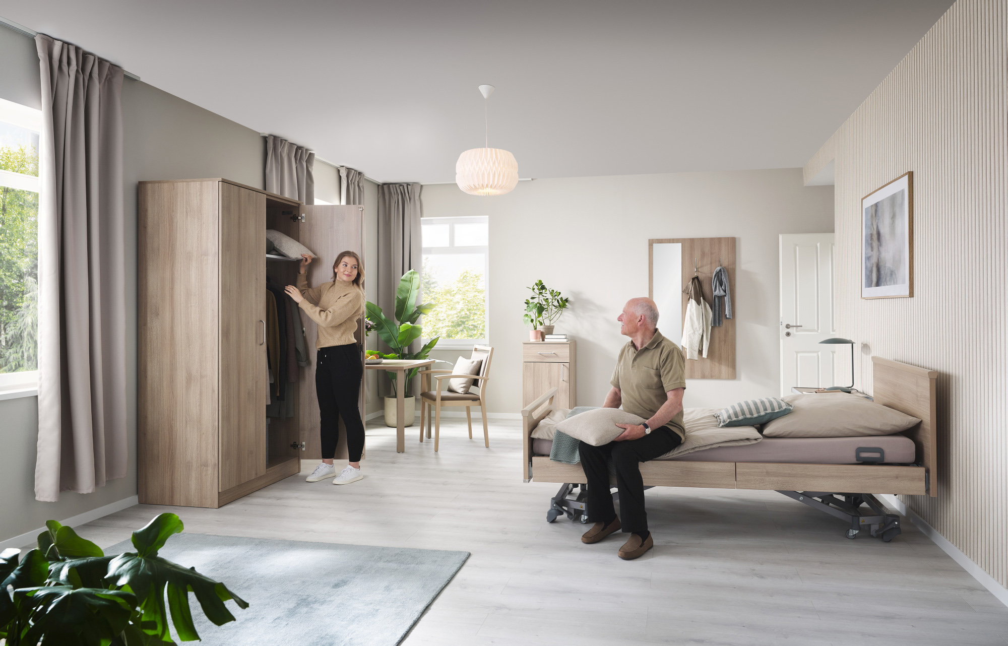What does such a comprehensive solution from a single source look like in concrete terms? Imagine, for example, a resident's room in a nursing home. A floor-level bed such as our Tereno helps with fall prevention. The low Aparto brevo bedside cabinet fits perfectly with the bed and offers maximum ease of use. Cupboards and chests of drawers with wood decors that match the bed create a wonderfully homelike atmosphere. A table with comfortable chairs provides space when the children come to visit. A modern Out-of-Bed system increases safety at night. And with the competent maintenance of our service technicians, all these products are ready for use at any time and often have a life cycle of decades.