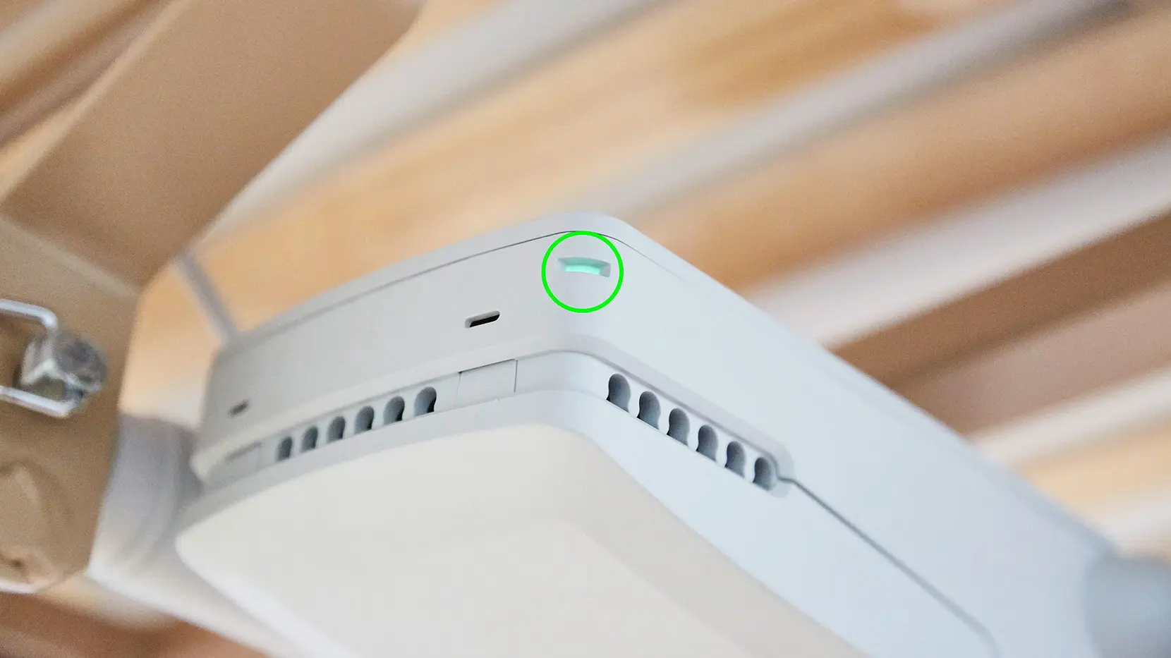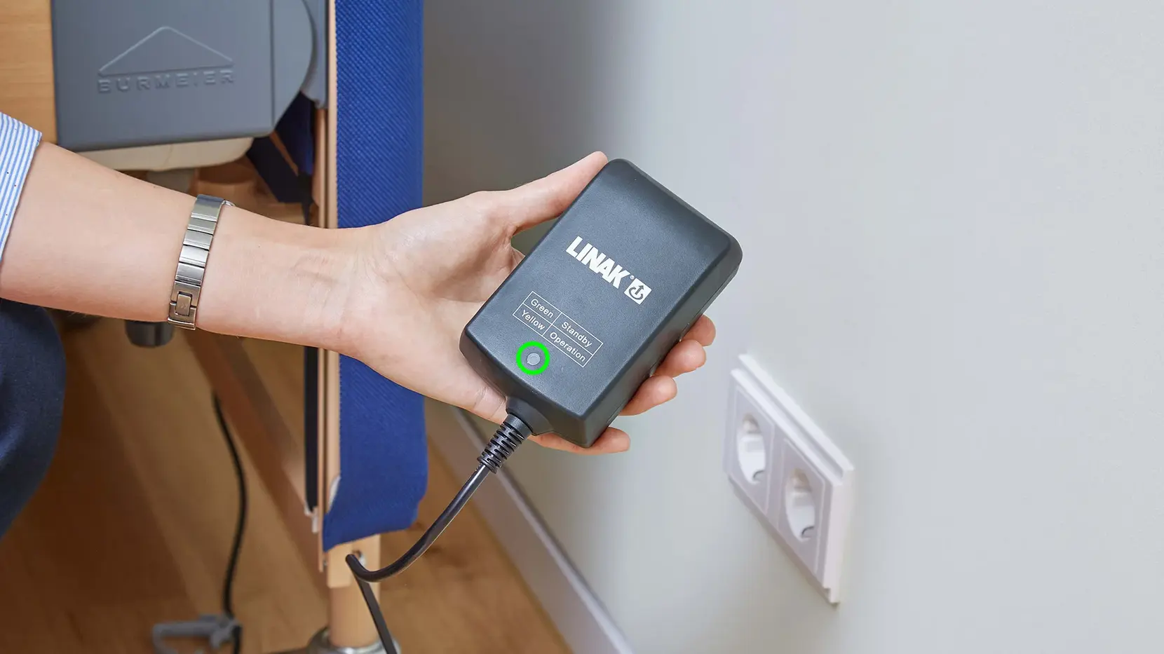 8. For the pairing to work, the control unit must be connected correctly. An LED on the control box underneath the backrest provides you with this information. When the bed is connected to the mains power, it first flashes yellow and then glows green. If no light is visible, the medical supply store employee should check the plug connection of the power supply. For this, please follow the instructions in the instructions manual (Part B, Chapter 3.7: Electrical connection).