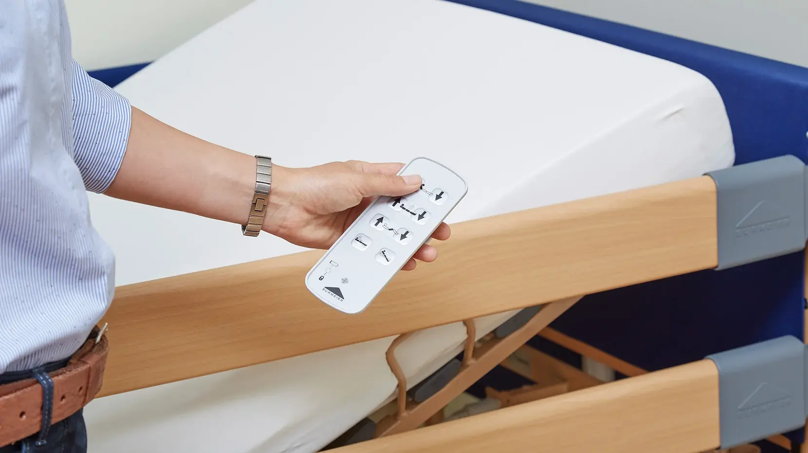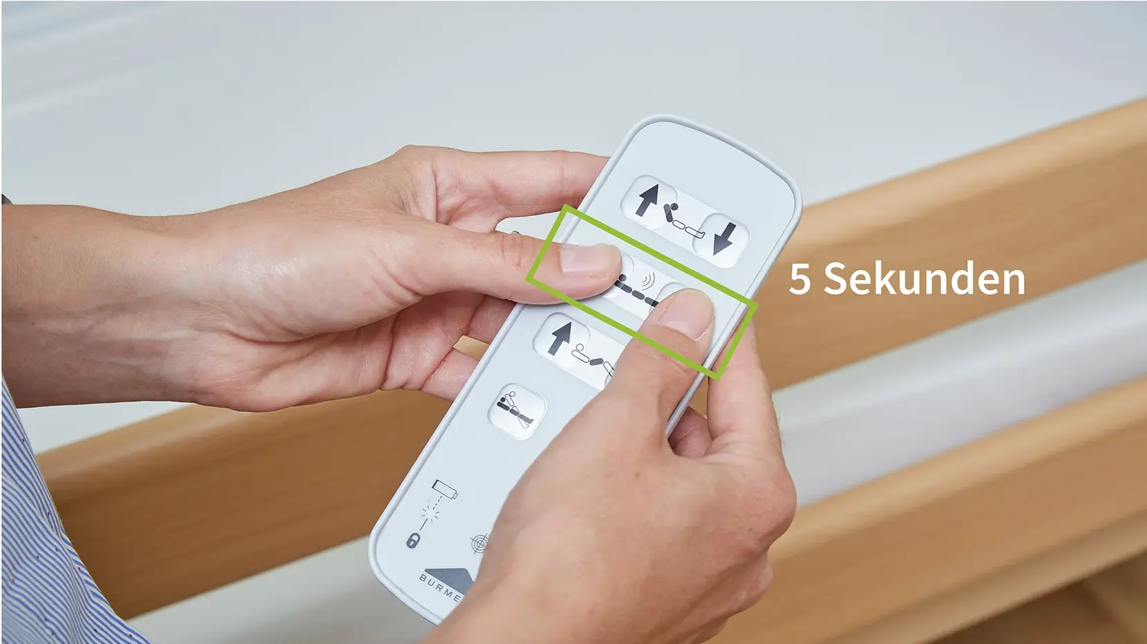 2. Point the handset towards the bed near the backrest. Press down the two buttons in the 2nd row (height adjustment of the mattress base) for at least 5 seconds. Please make sure that the buttons are pressed simultaneously and not with a delay.
