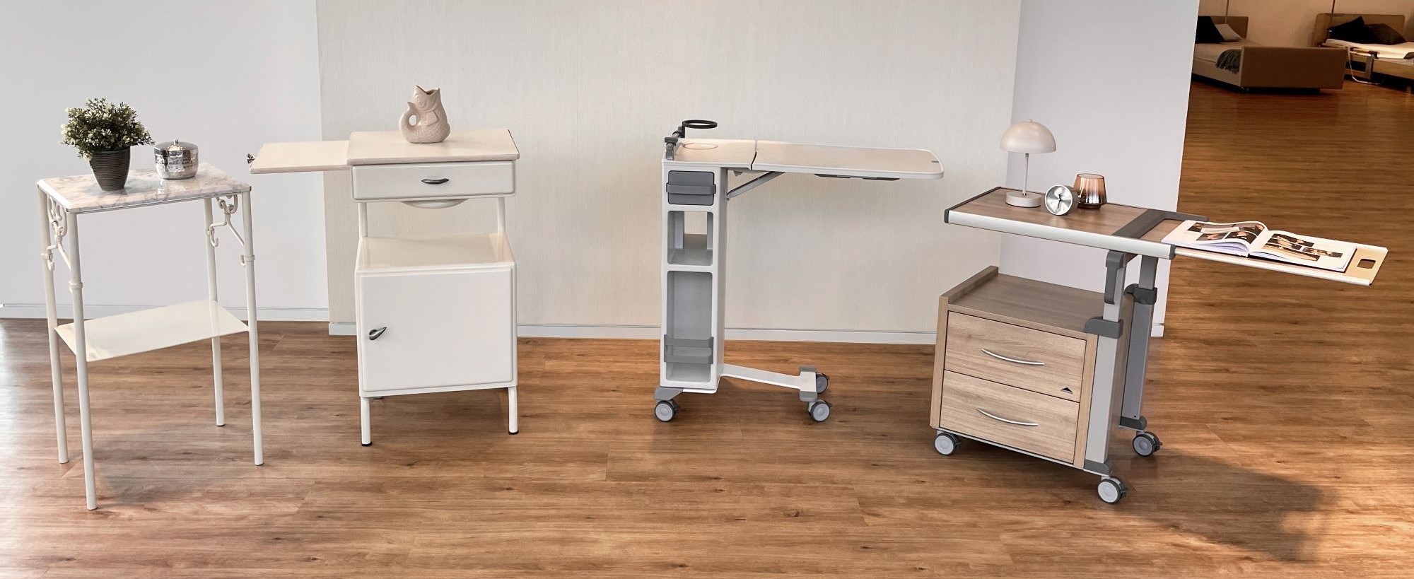 Ya en este punto queda claro que las mesas de noche han desempeñado un papel importante desde el inicio a lo largo de los 125 años de historia de la empresa. Y, sin embargo, siguen siendo jóvenes y modernas. Cuando nuestra innovadora serie de mesas de noche para centros de cuidados Aparto salió al mercado, lo hizo bajo el lema: “Aparto – mesas de noche redefinidas”. Un eslogan acertado que, aun así, plantea preguntas: ¿cómo y cuándo se definía antes la mesa de noche?